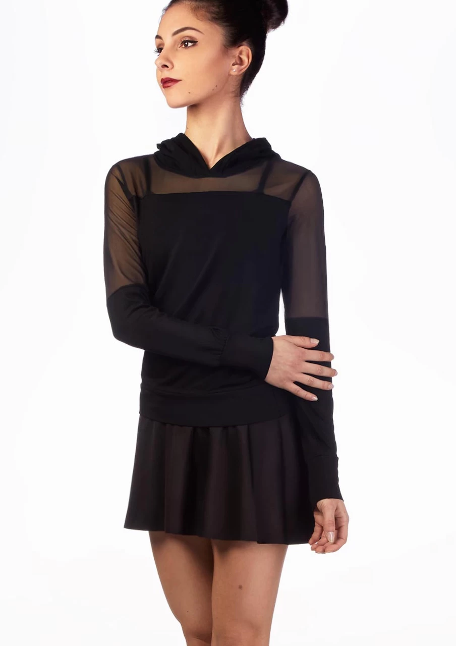 Are you bored of your warm ups? Ballet Rosa brings sophisticated style innovation to your warm ups wardrobe with mesh panel inserts that elevate your fitness looks to new fashion heights. This supersoft mesh hoodie features mesh panel inserts on the neckline, shoulders, and upper arm. It’s the perfect on-trend hoodie for any class from ballet to street dance. Try wearing this hoodie outside of class for your dance fitness exercises.