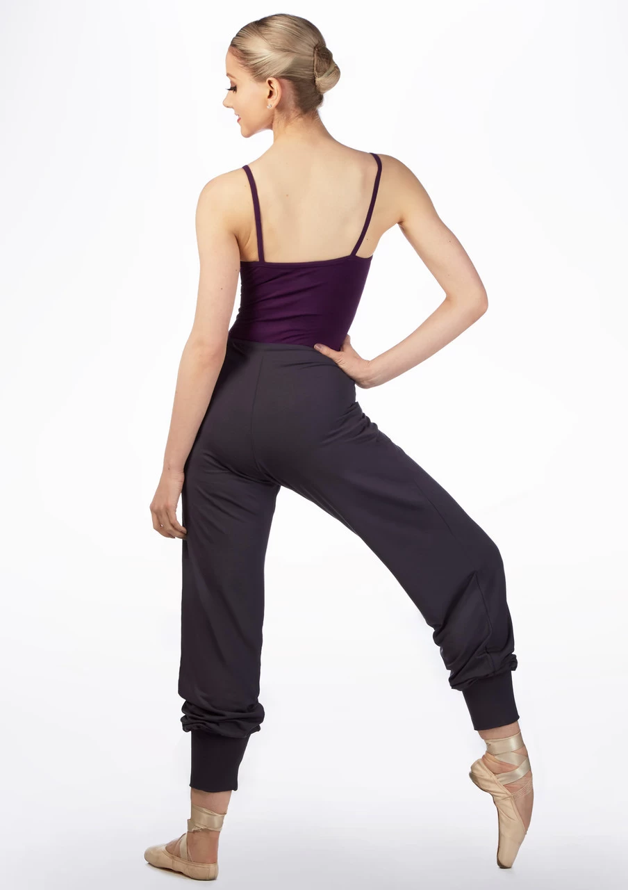 These soft bamboo pants by Ballet Rosa are comfortable for hours of teaching and dancing. They’re also great for warmups, but the stretchy, sweat-wicking fabric makes them ideal to dance in. Tapered ankles create a unique look that extends the legline.