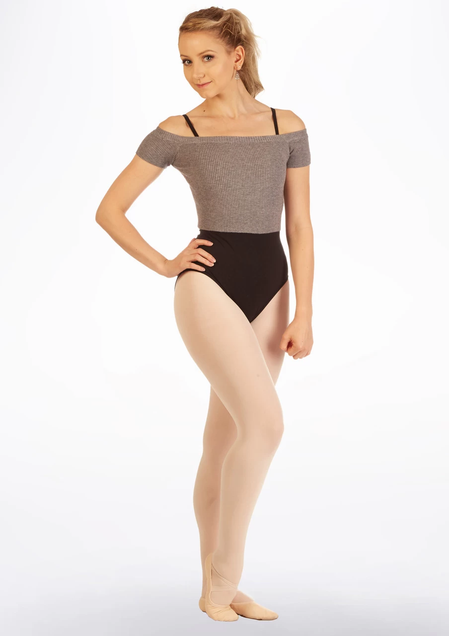 Inject a little style into your warmups wear with this cropped dance sweater by Capezio. The bardot neckline and capped sleeves are a dainty look to slim down your usual bulky warmups outfit!Â