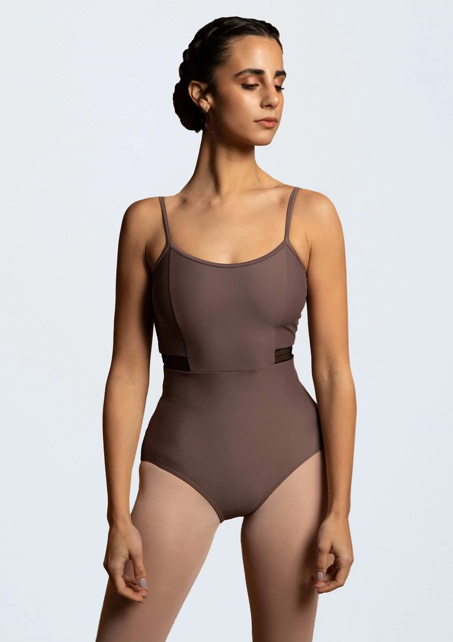 A successful day in the studio starts with this leotard. The camisole straps are perfect to keep you cool and a panel effect at the front pulls you in at the waistline creating a flattering finish. This lovely leotard has full front lining for extra support. We love the back of this leotard, featuring ornament ribbon and mesh details that flow to the side of the leotard and are slightly visible from the front. A flattering and comfortable leotard you’ll wear again and again.