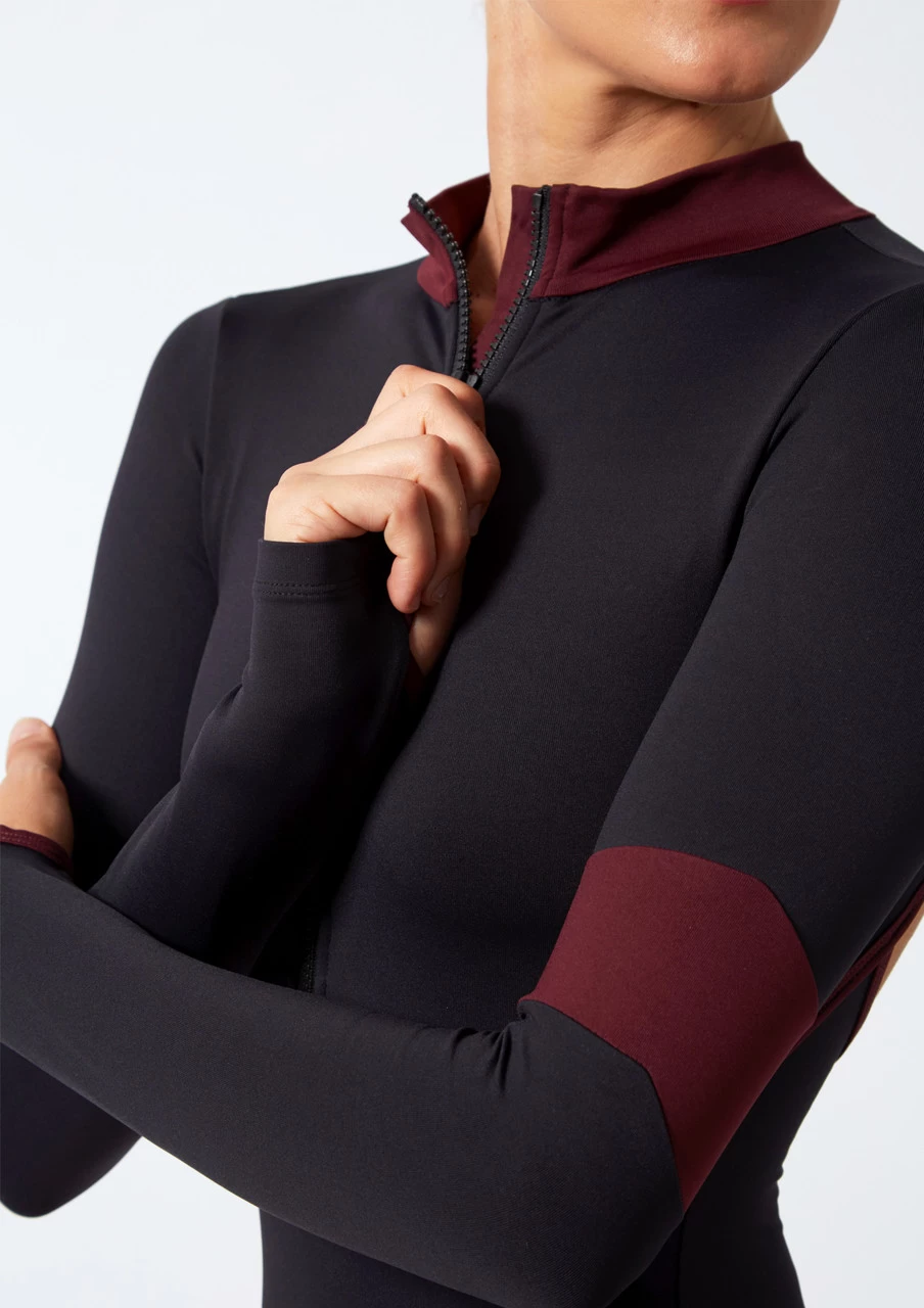 Dance like you mean it in this flattering leotard with a cut out on the back. The long sleeves and turtleneck style combination elongates the body so you can stand tall and confident. The thumbhole detailing in the sleeves is a cool modern detail and adds comfort for when you’re dancing. This black leotard incorporates a pop of colour around the neck and on the left arm so you can stand out whilst you perform.