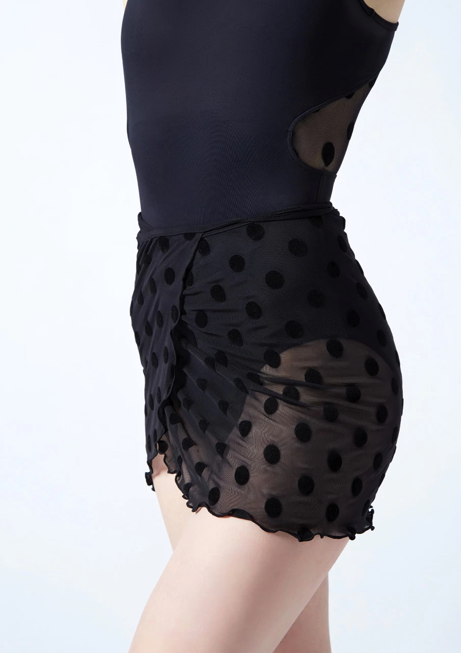 The Lydia Skirt is a statement piece designed for long days in the studio. Featuring an elegant flocked polka dot design that will pair perfectly with a black leotard. The sheer mesh style is lightweight to keep you cool and flows with your movement. The Lydia is a wrap skirt and ties at the back.