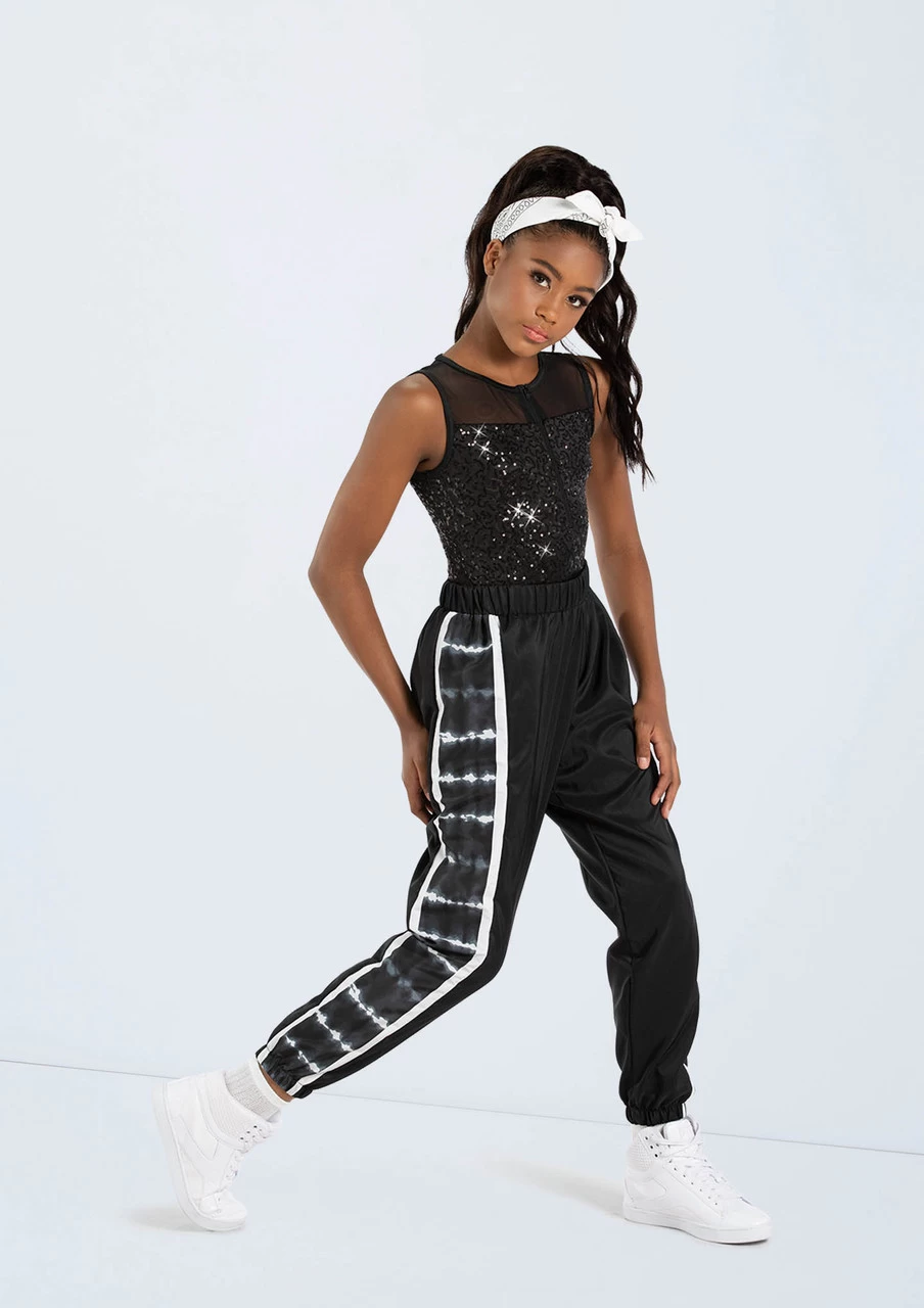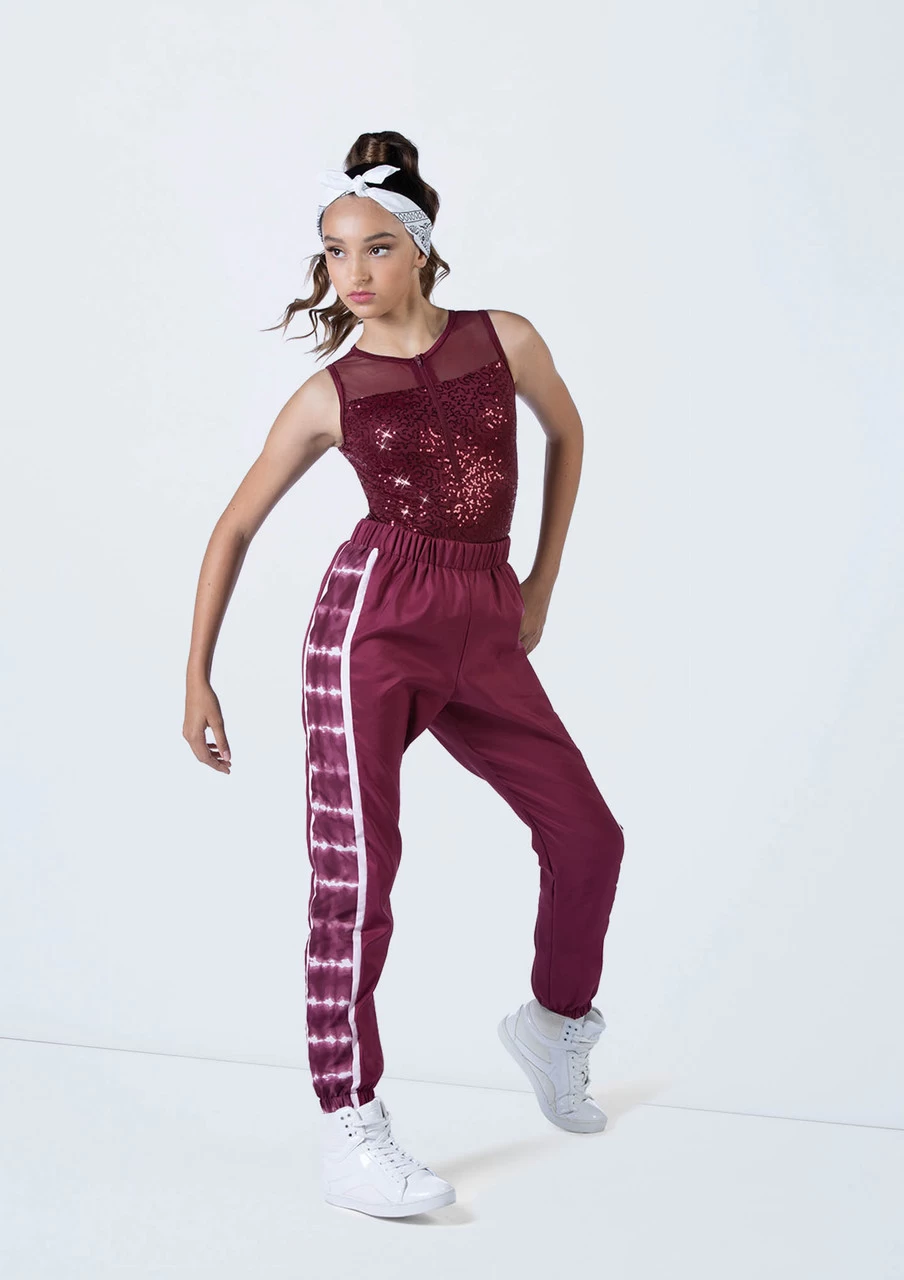 -Two piece, includes leotard and jogger pants
