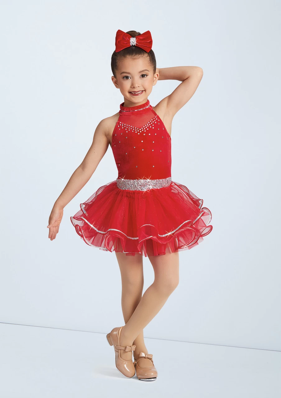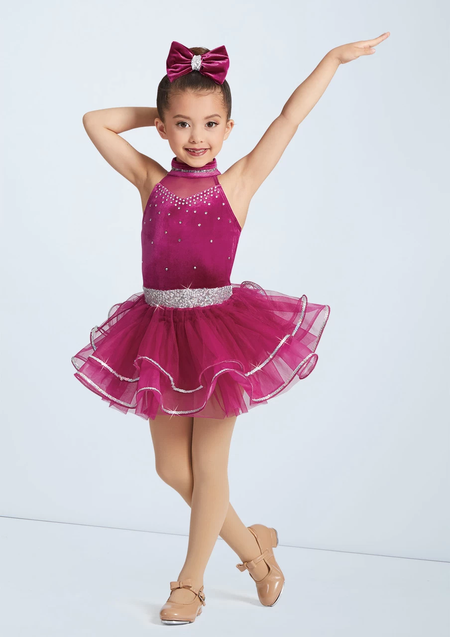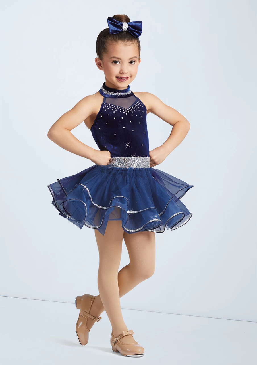 Sparkle and shine under the spotlight with a sprinkling of beautiful Austrian crystals on this dress. These impressive rhinestones are complemented by mesh inserts for the ultimate sweet look. The snap closure of this costume allows for ease and convenience for those fast changes between numbers!