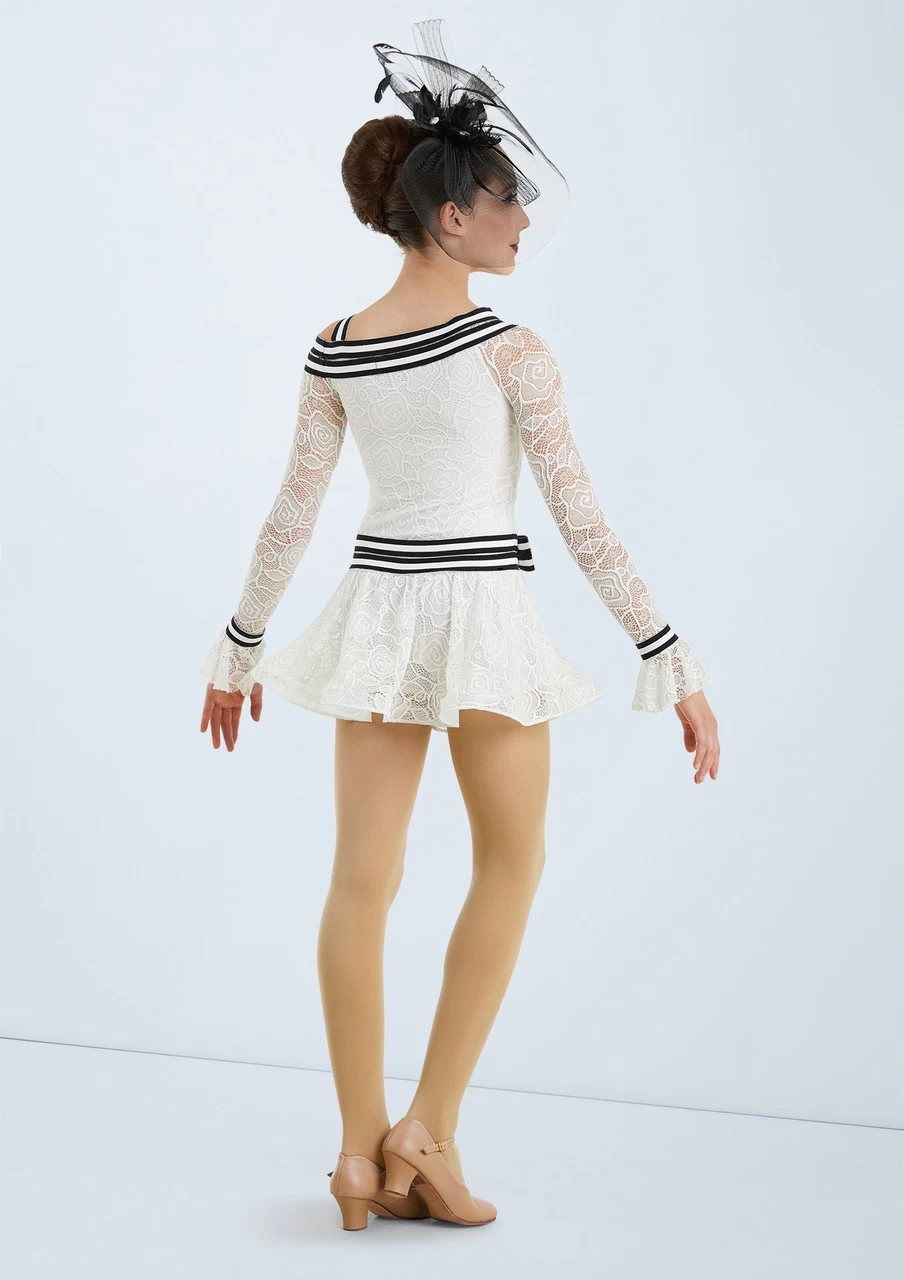 Dance all night in this ‘My Fair Lady’ inspired white lace costume with a feathered fascinator. This pretty biketard features stripes and bows on the neckline and waistline which are elasticated to allow flexibility and comfort for dancers. The lace detailing on the full length sleeves and skirt adds to the delicate, feminine look.
