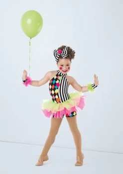 Make the audience laugh in this fun clown-inspired costume with pom-pom buttons and a matching hair bow. The black and white striped biketard features bright shaped colours and a two tone attached skirt. Wear the included hair accessory and gloves to complete the look.