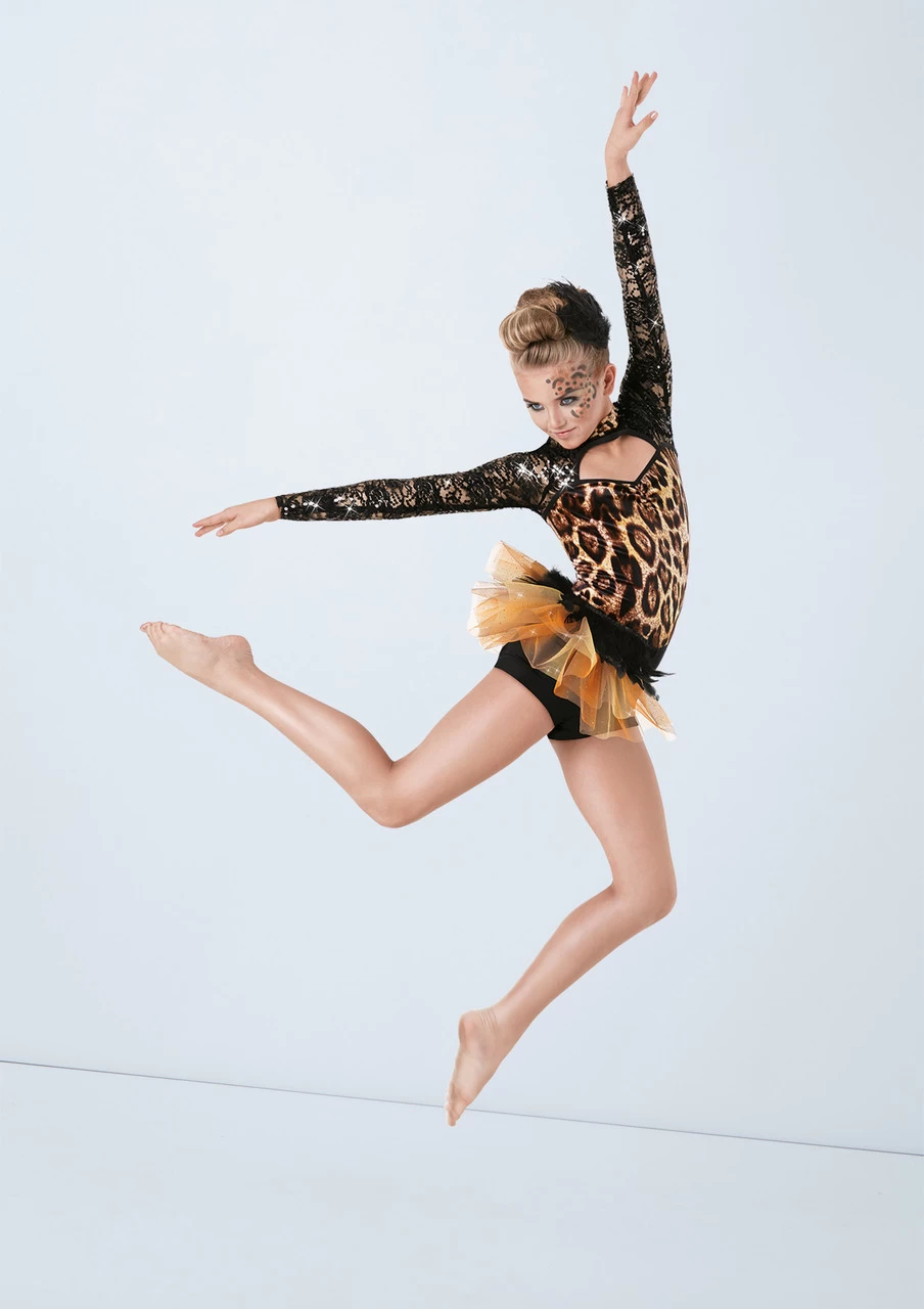 Bring out your wild side in this leopard print velvet bodice with sequin and feather detailing. The costume features an ombre side skirt with feathers which matches the included feather clip. The lace, sequined long sleeves of the biketard will sparkle under the stage lights and provides a flattering look along with the cut out on the front of the costume.