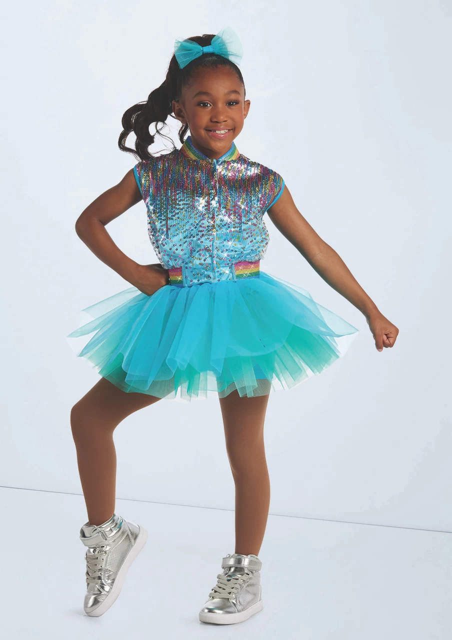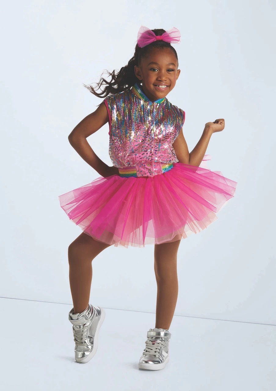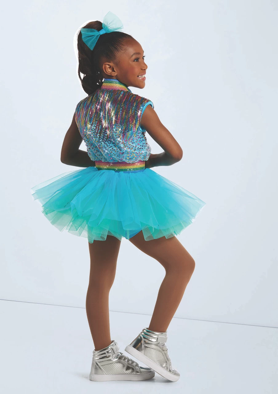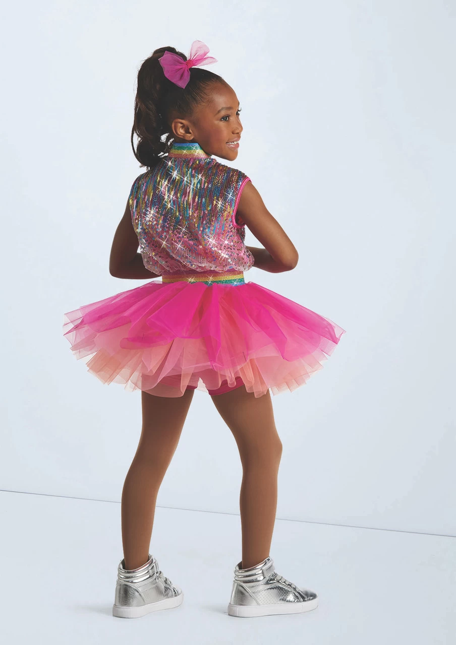 Vest is Ombré rainbow sequin over stretch satinÂ